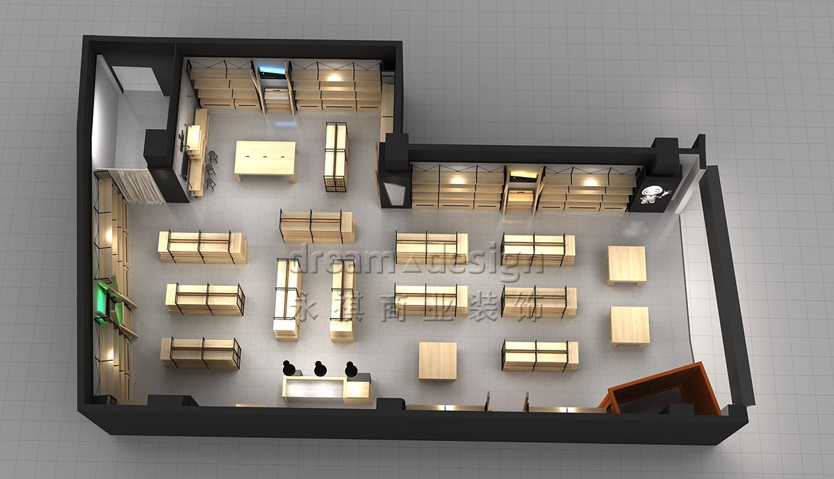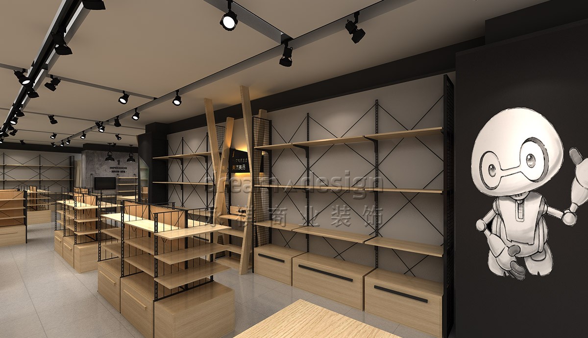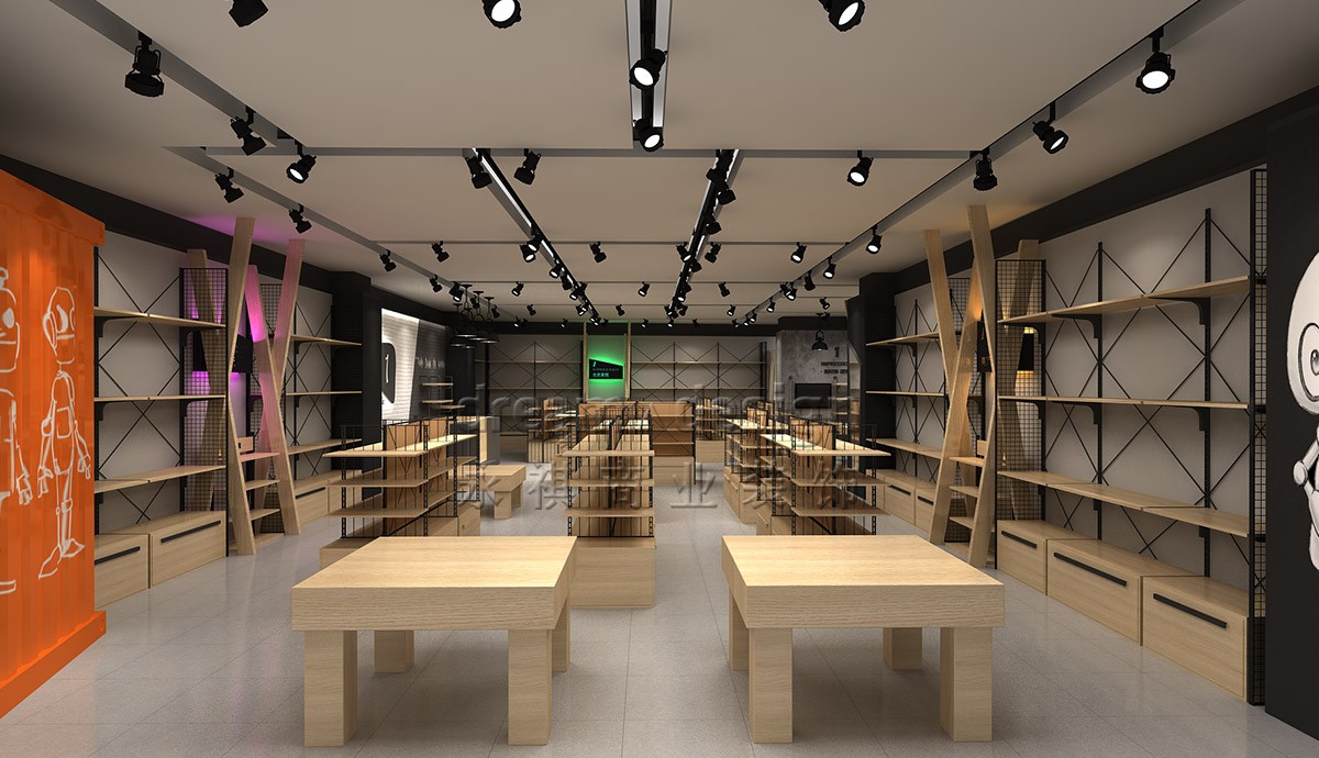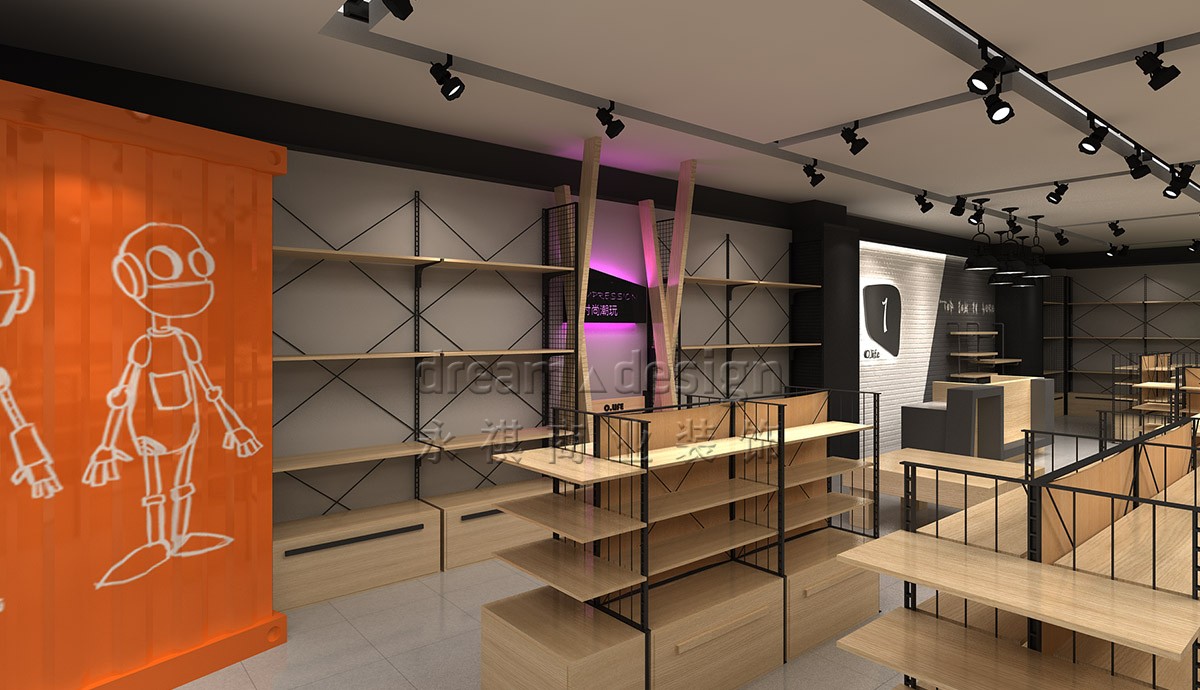為了打造出當(dāng)下最流行最FASHION的時(shí)尚用品專營(yíng)店,永祺設(shè)計(jì)師采用大塊橙色面積的集裝箱、黑白相見(jiàn)的文化磚墻、各款異型時(shí)尚柜型來(lái)營(yíng)造氣氛,店面給人的整體效果動(dòng)感時(shí)尚、富有個(gè)性,符合潮玩一族的購(gòu)物心理審美要求。