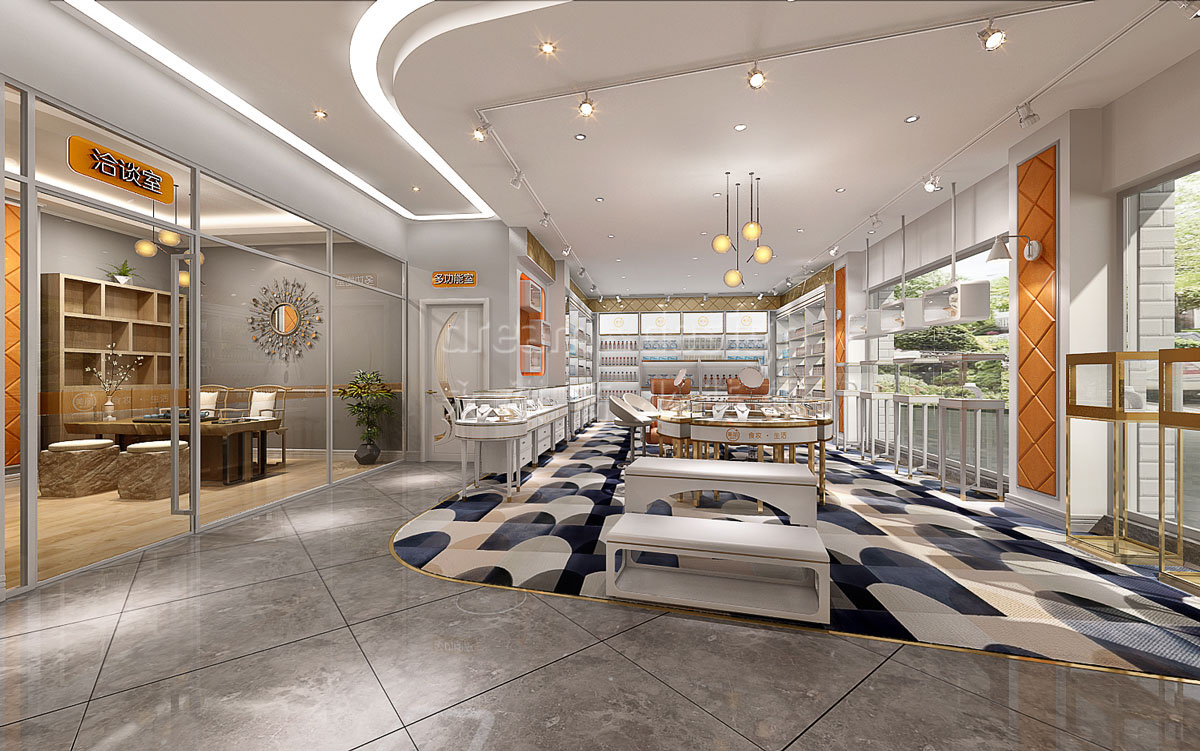 美麗+食妝生活館以白色、愛馬仕橙色、淺木紋色為主,結(jié)合精致的陳列柜型及多樣的空間布局,打造出時尚大氣明亮的珍珠銷售體驗店。