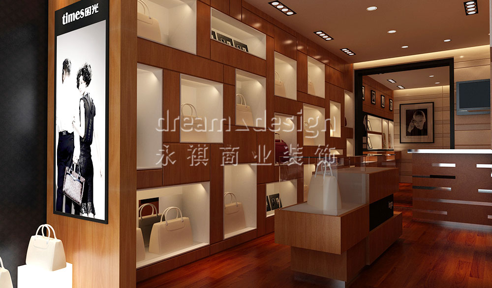 營(yíng)造的溫馨氣氛激活人的藝術(shù)細(xì)胞使之變得對(duì)美更加敏感,陳列臺(tái)的設(shè)計(jì)融合了現(xiàn)代風(fēng)格跟古典美,在跟溫暖的燈光交織下將TIMES時(shí)光的包包展現(xiàn)的淋漓盡致。