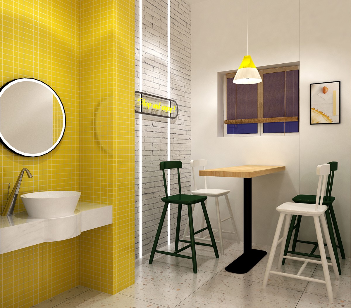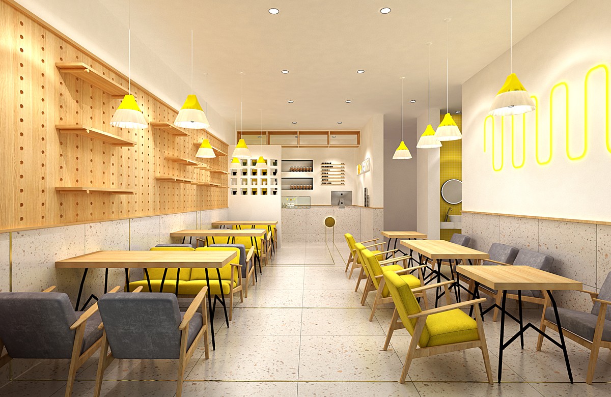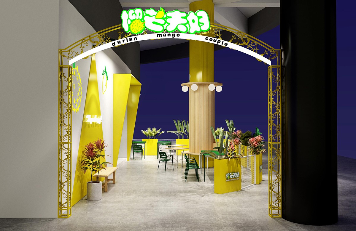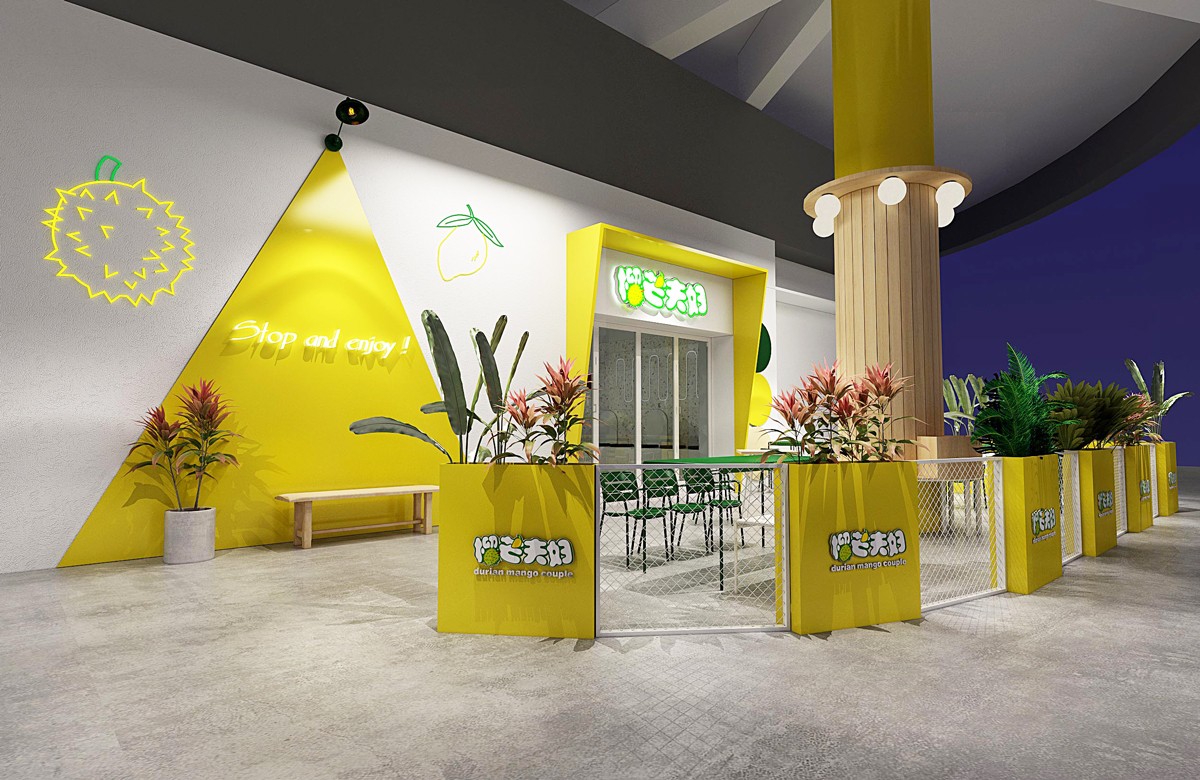 永祺商裝選取榴蓮和芒果的黃色作為主色調(diào),從門頭到到背景墻大面積使用,給人強有力的視覺沖擊。同時使用風(fēng)格獨特的暖光燈,搭配北歐極簡風(fēng)的家居用品,營造一種輕松愉悅的氛圍。合理利用空間設(shè)計了室外就餐區(qū),充分滿足消費者多種需求。并且特別制作了一個兒童游樂區(qū),利用積木、木馬、飛機等元素增加童趣,給孩子提供一個休閑娛樂的空間。