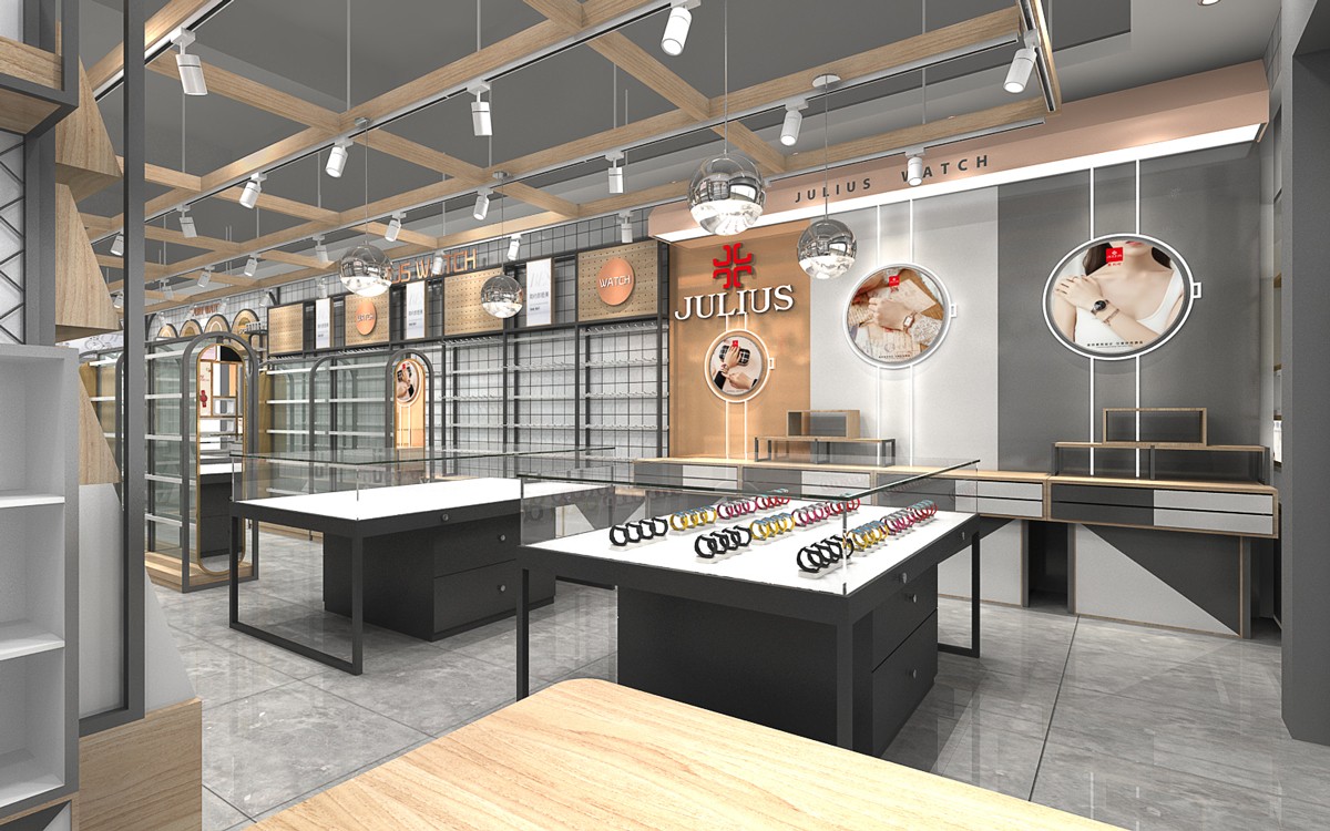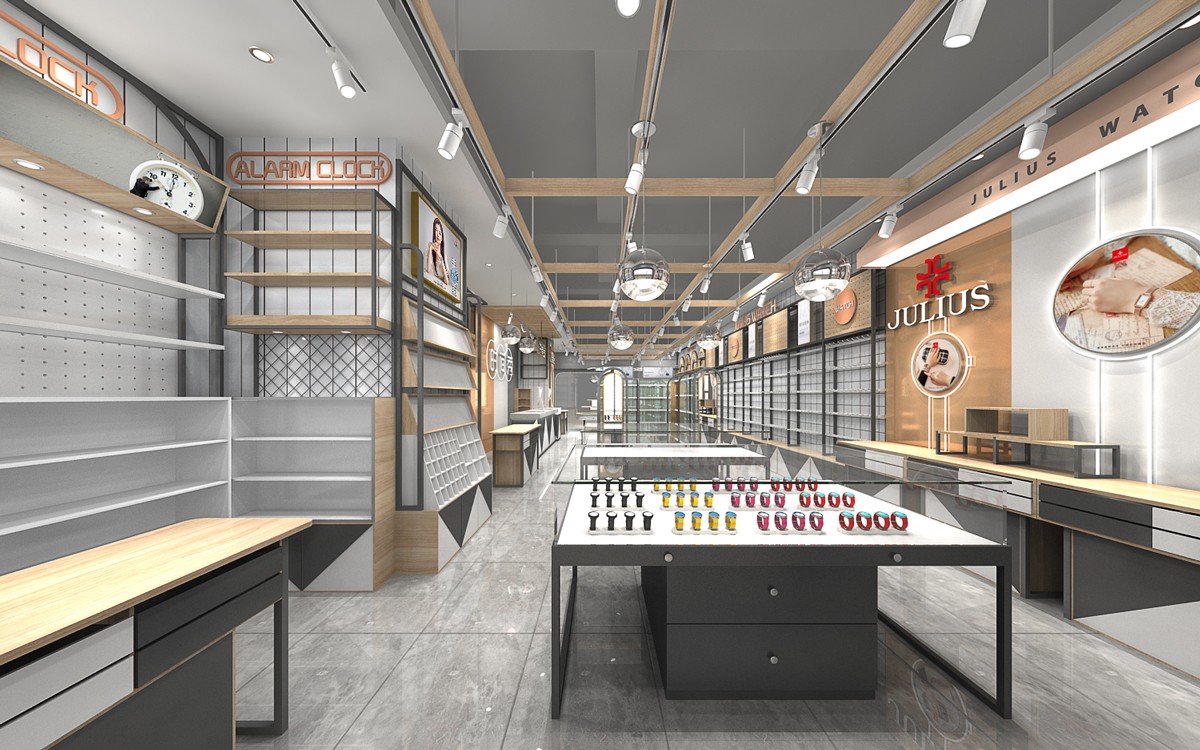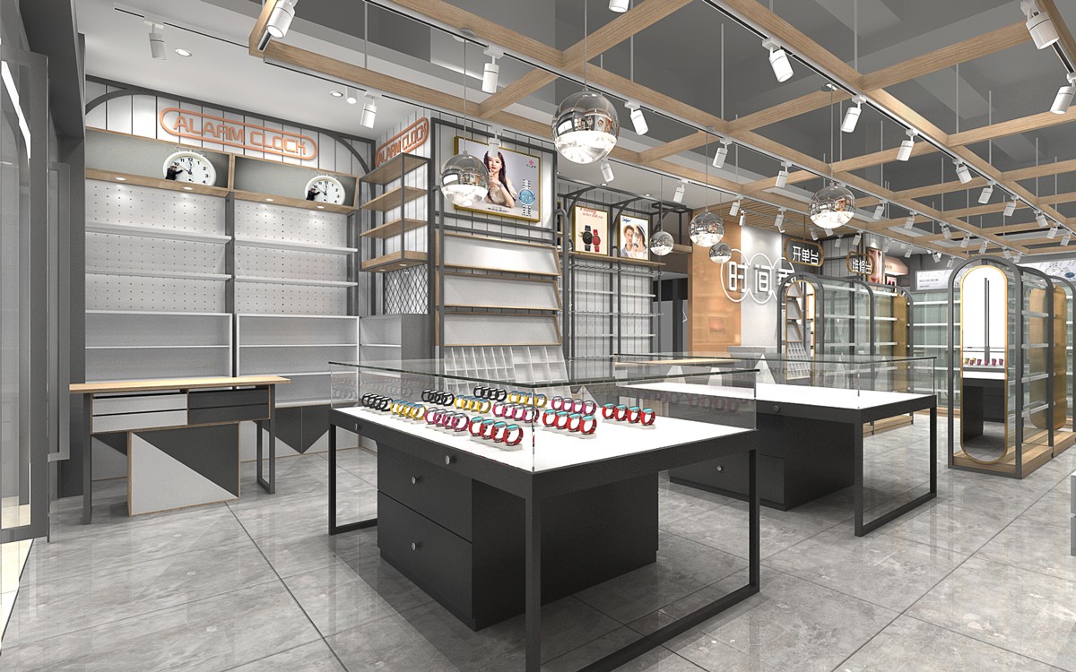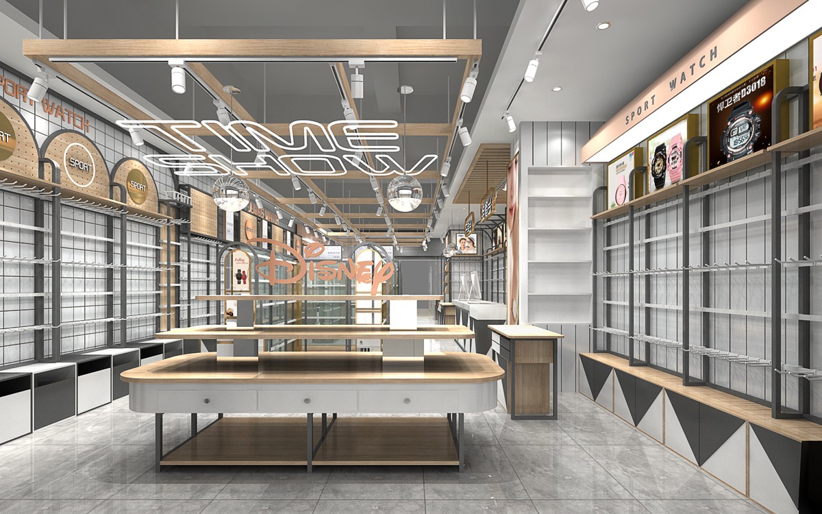 店內(nèi)主營的是手表、鬧鐘,都是跟時間有關(guān)的。所以店面門頭采用雙邊鐘表盤形象,配合“時間秀”“TIME SHOW”的logo,讓人一目了然看到店面形象,從而也吸引顧客進店購物。門頭也采用鈦金不銹鋼金屬元素,增加店面品質(zhì)感。 店內(nèi)呈現(xiàn)效果簡潔明亮,以白色、灰色、原木色打造輕松舒適購物環(huán)境。手表陳列整齊有序,配合形象燈箱畫面、金屬吊燈、幾何三角形元素,使空間更具通透層次感。更加提升店內(nèi)檔次,增加客流量提高銷售額。