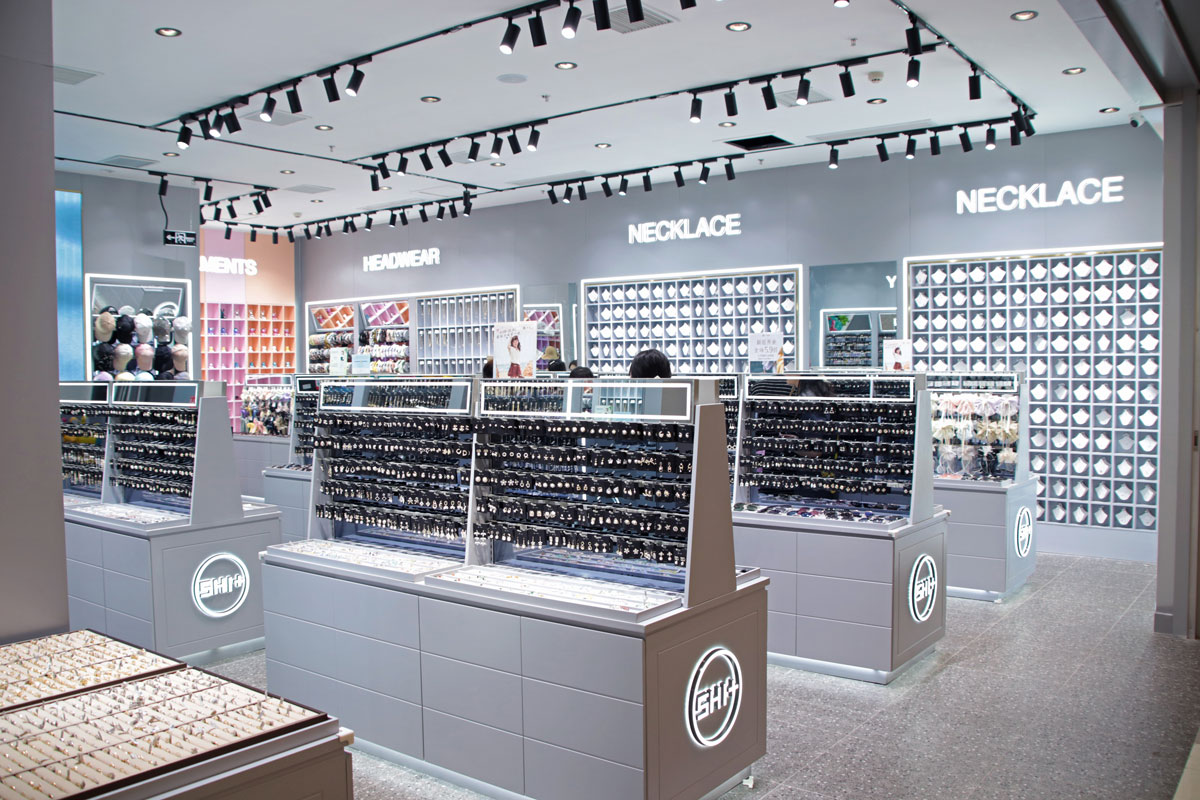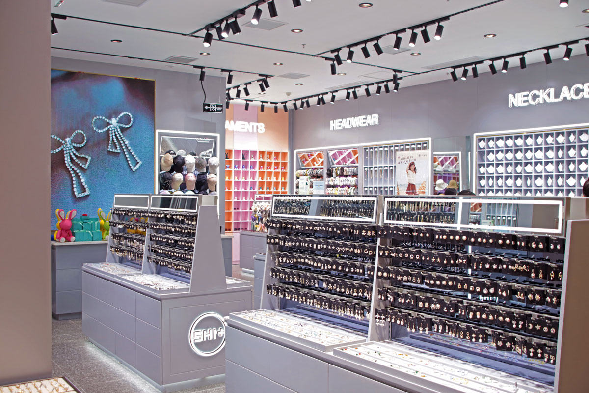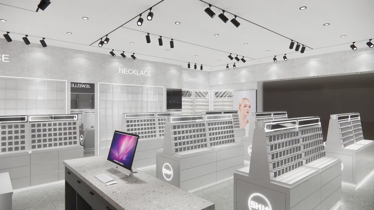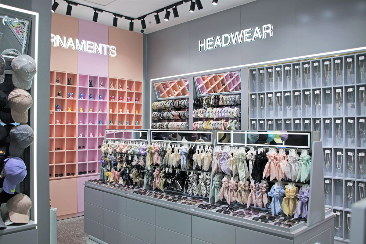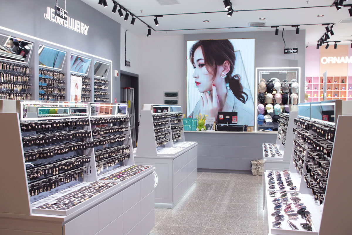 整體店面是當(dāng)下流行的ins風(fēng)格。擁有獨(dú)具特色的裝潢設(shè)計(jì),充滿藝術(shù)感和空間感,色彩以白灰為主,搭配色調(diào)馬卡龍芭比粉色,充滿年輕活力,給人滿滿的少女感。整體明亮的燈光氛圍、簡(jiǎn)約時(shí)尚的貨柜造型,打造時(shí)尚潮流的新型飾品連鎖店面。
