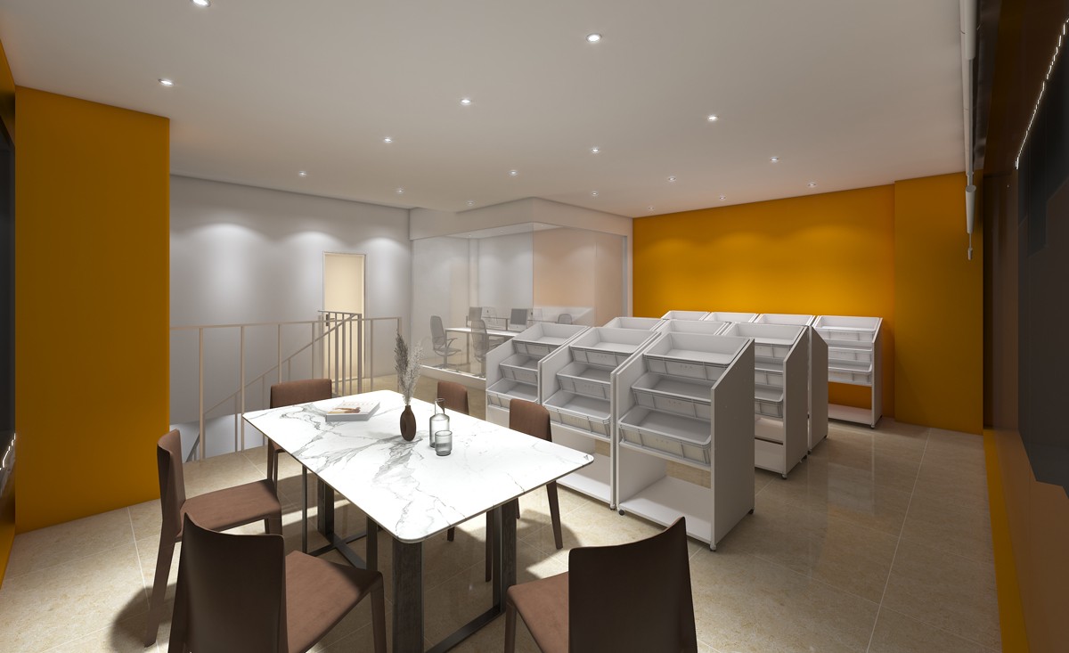 空間設(shè)計上大面積運用品牌主色,溫暖歡快的橙黃點亮了店面的視覺,營造出舒適愜意的空間氛圍。同時明媚溫馨的橙黃在色彩上鏈接金色的秋天與豐碩的果實,所以也有著富足與幸福的意義。