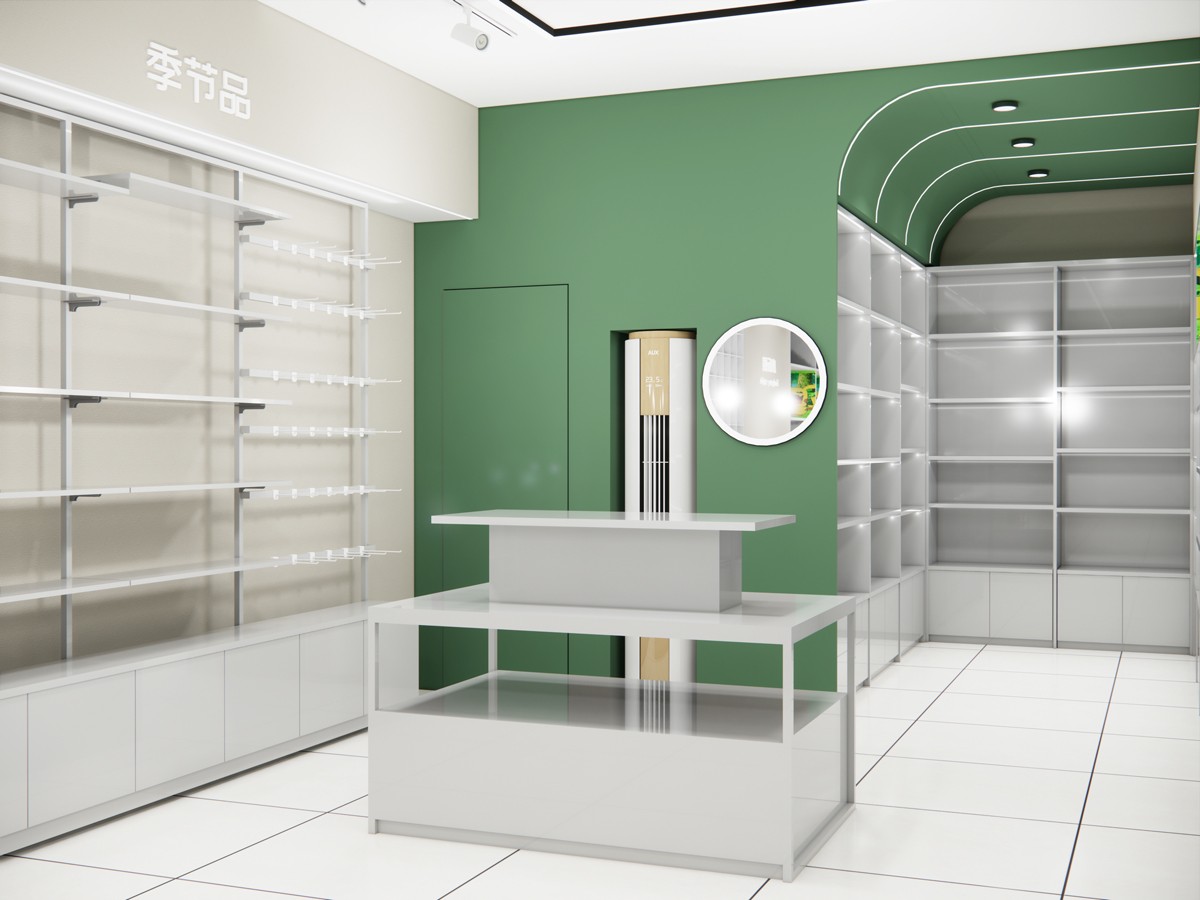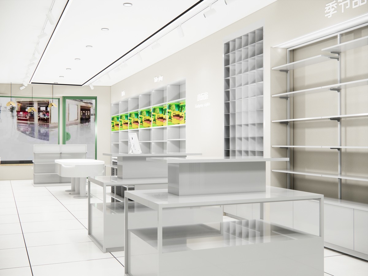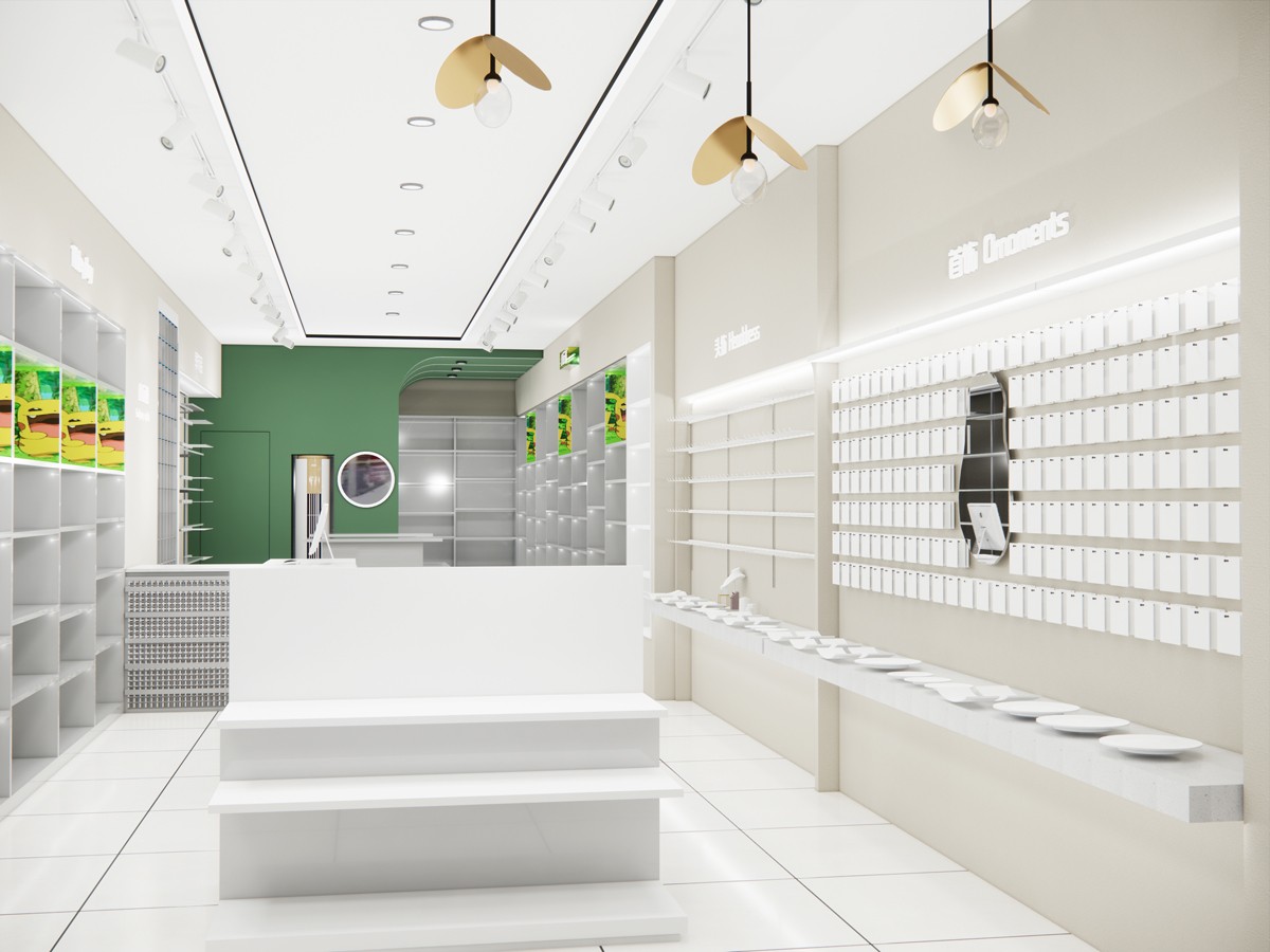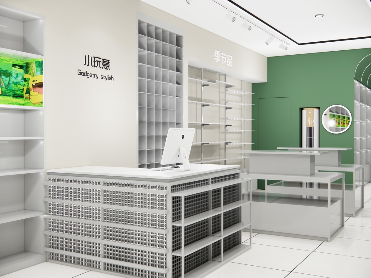 永祺設(shè)計師在第一稿設(shè)計以商場店為目標,為小玩意的設(shè)計偏向復古的風格,展柜采用深色木紋柜體,讓整個空間看起來沉穩(wěn)優(yōu)雅。第二稿設(shè)計遵循客戶意見,采用時下年輕人更喜歡的淺色色調(diào),柜體也采用白色,讓整個空間顯得清新活潑。