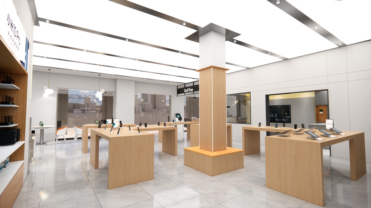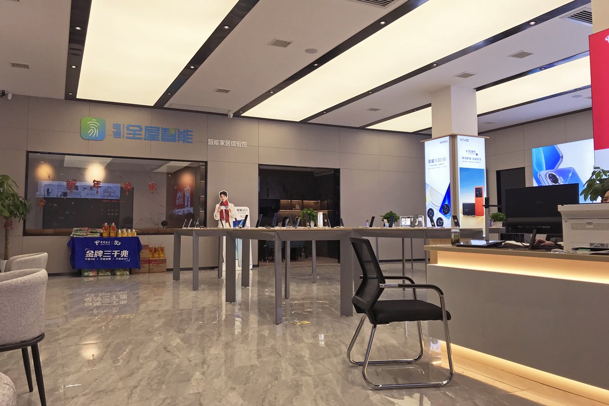 在230㎡的營業(yè)廳中,對(duì)體驗(yàn)區(qū)、休息區(qū)、服務(wù)區(qū)進(jìn)行明確的功能劃分,滿足產(chǎn)品銷售展示同時(shí),帶給客戶更輕松舒適的進(jìn)店體驗(yàn)。此外,遵循品牌通透簡約的空間設(shè)計(jì)需求,以白與銀灰作為空間主色,采用大面積的頂燈作為照明,使得環(huán)境簡約敞亮的同時(shí),更富有科技感,契合品牌通信先行者的行業(yè)地位。電信智慧營業(yè)廳新增了智能家居情景體驗(yàn)館,讓用戶真實(shí)觸摸,直觀感受5G技術(shù)帶來的全新家居體驗(yàn)。