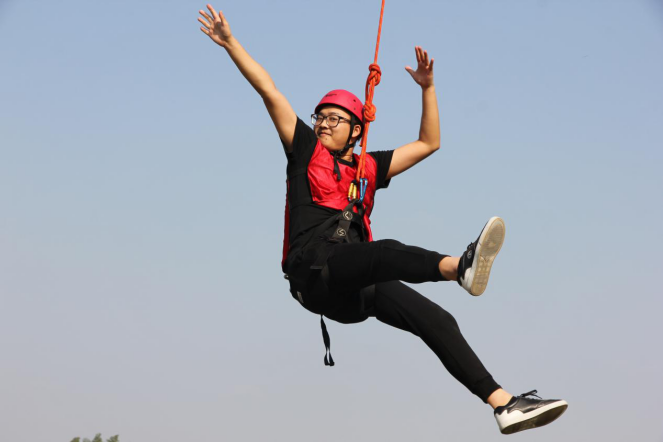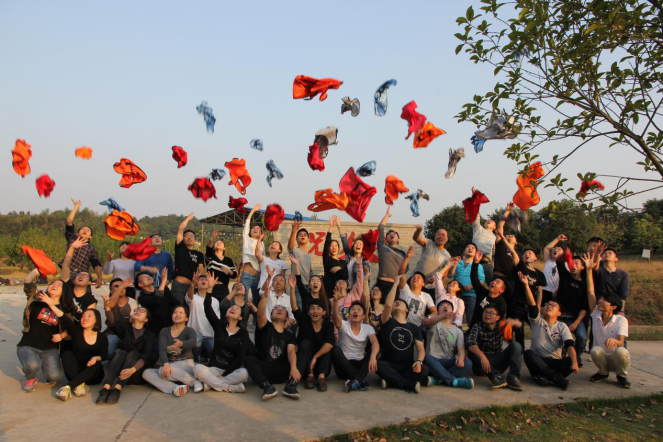夕陽西下,拓展順利“畢業(yè)”,大家振臂高呼,讓隊服來一次高空的飛舞吧!